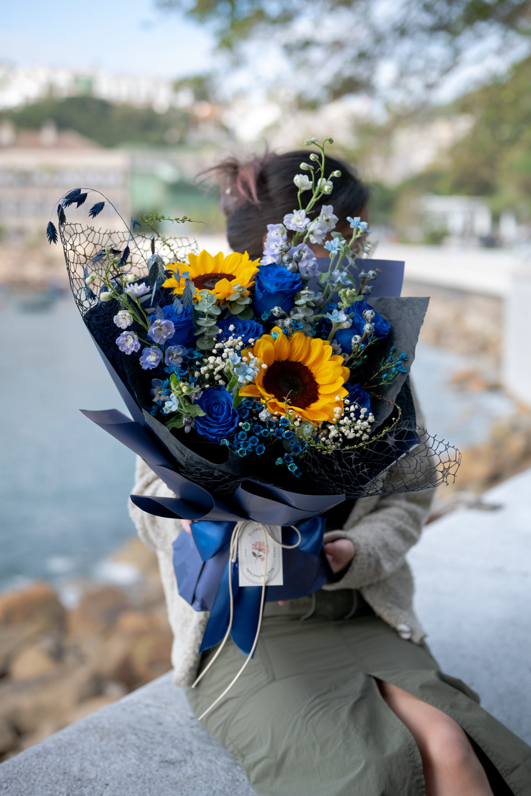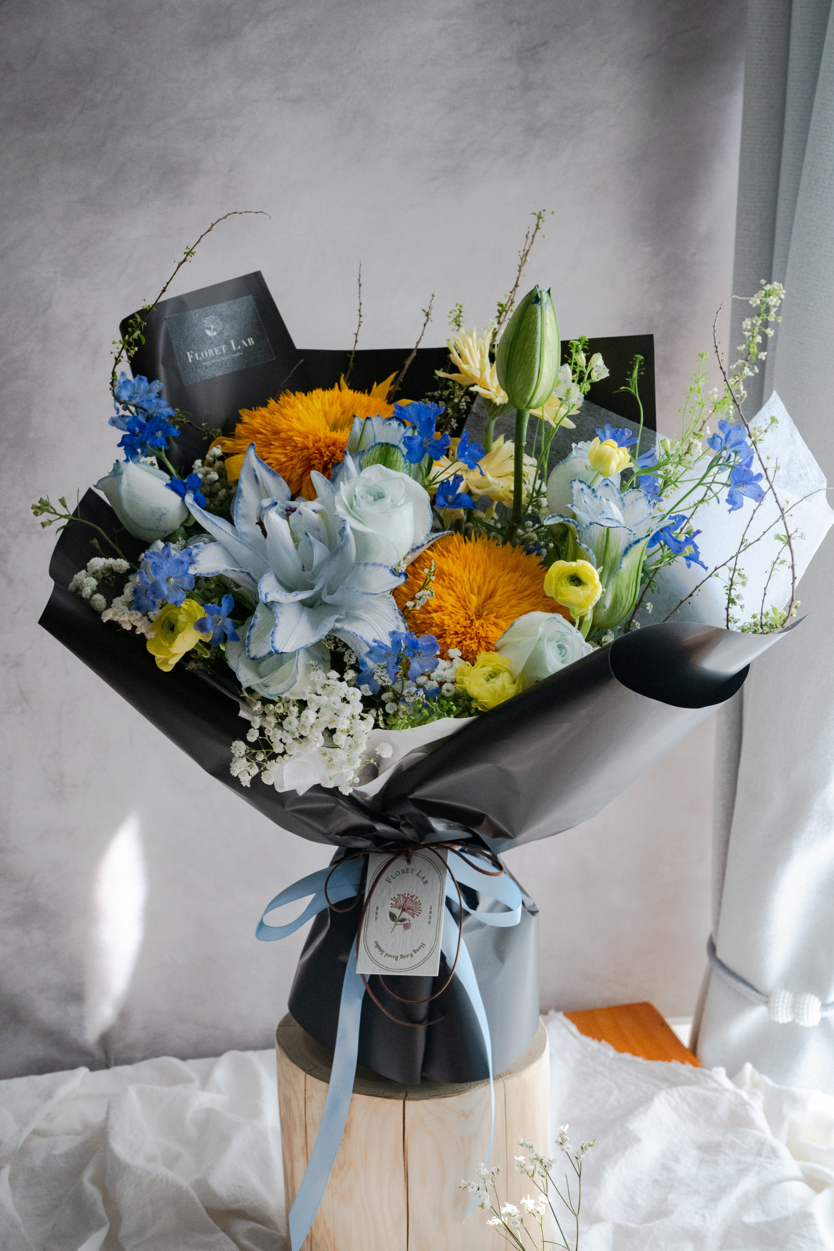 冷調染藍百合太陽花束